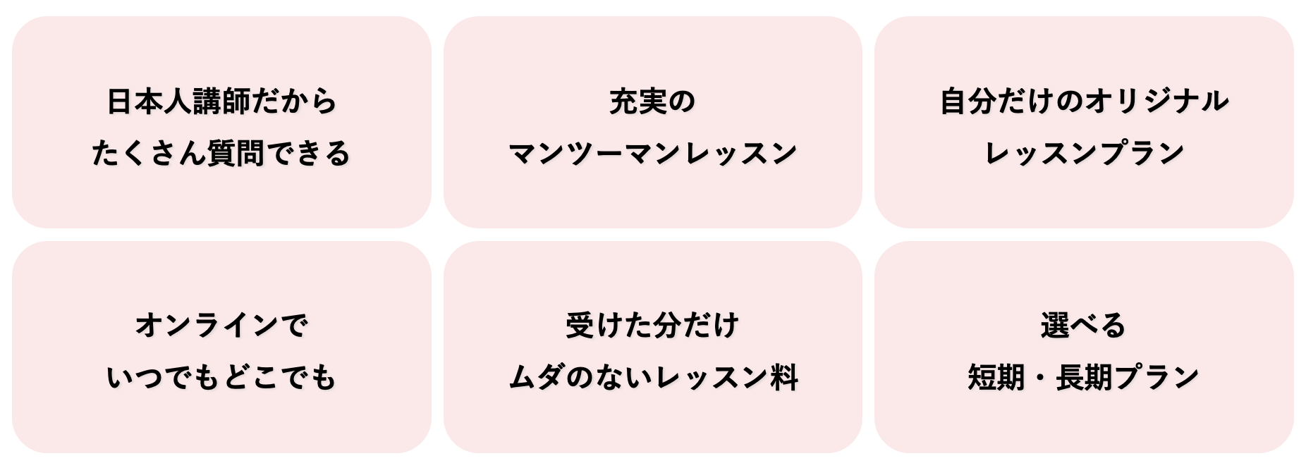 話し合います。レッスンプランは臨機応変で、例えば何ヶ月か先に海外旅行に行くことになった場合、旅行先で役立つフレーズを取り入れたり、英検を受けることになった場合は英検対策を取り入れたりすることも可能です。